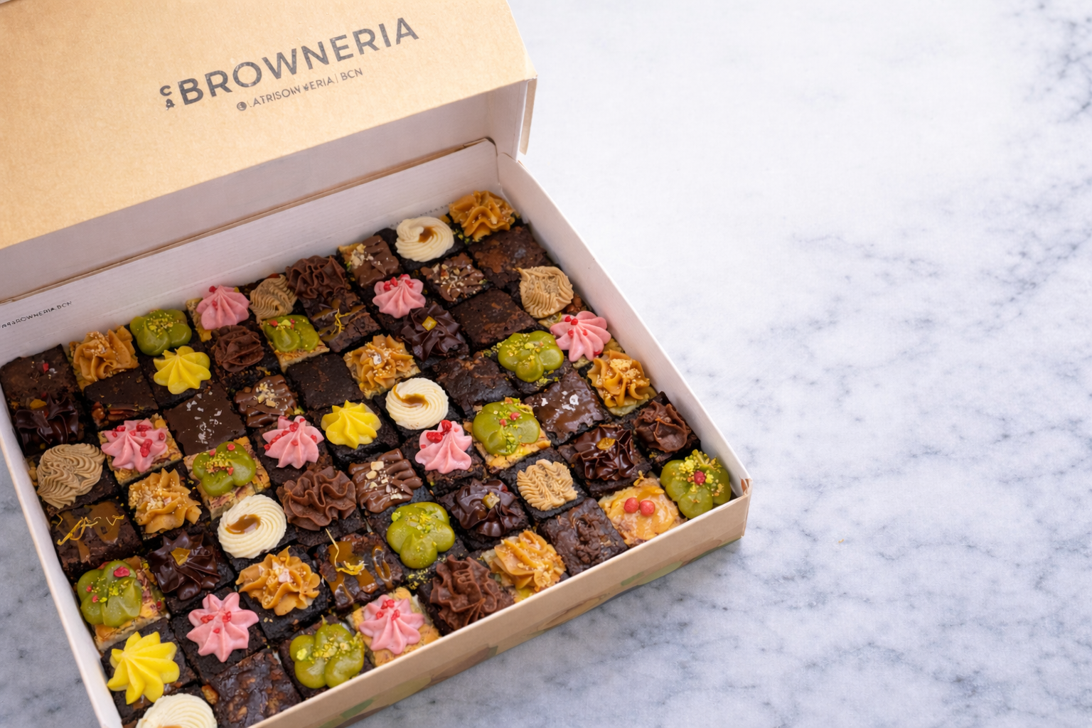 Caja variada de 63 mini brownies artesanales sin gluten, en una amplia selección de sabores. Pequeños bocaditos de 2 × 2 cm, ideales para compartir, para eventos o para regalar. Incluye brownies y blondies.